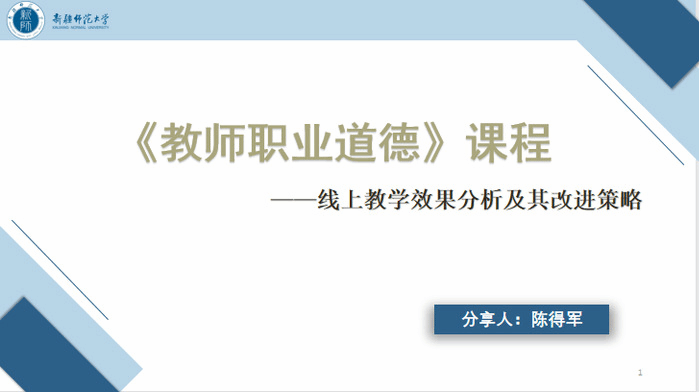 随后,系主任陈得军副教授对本学期开设并已结课的《教师职业道德》课程教学效果进行了分析。陈得军从授课效果及学习收获、考核方式及考核标准、课程安排及课程评价三个方面进行了汇报,分析了课程目前存在的问题并针对问题提出了下一步的改进策略。